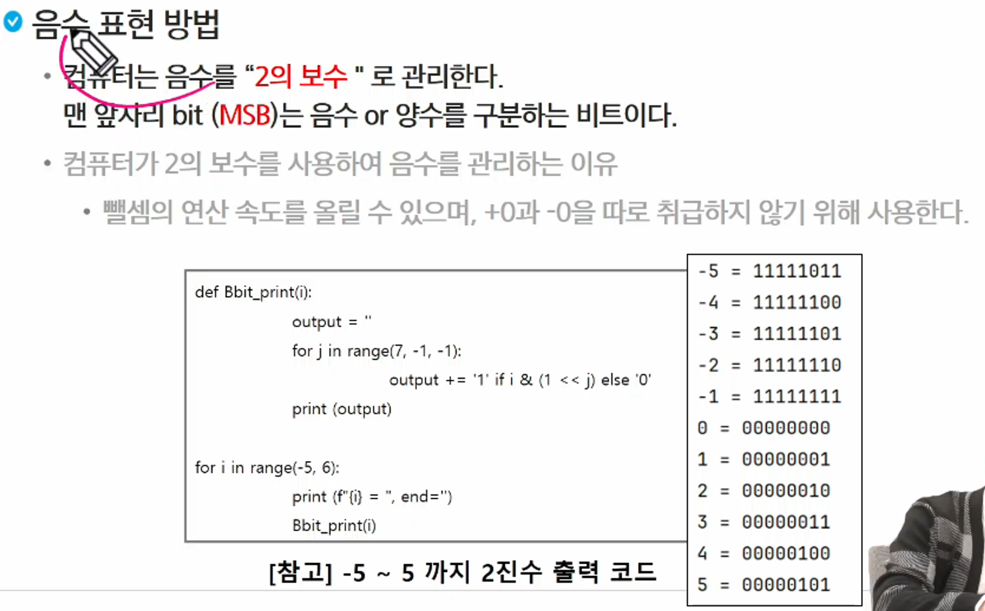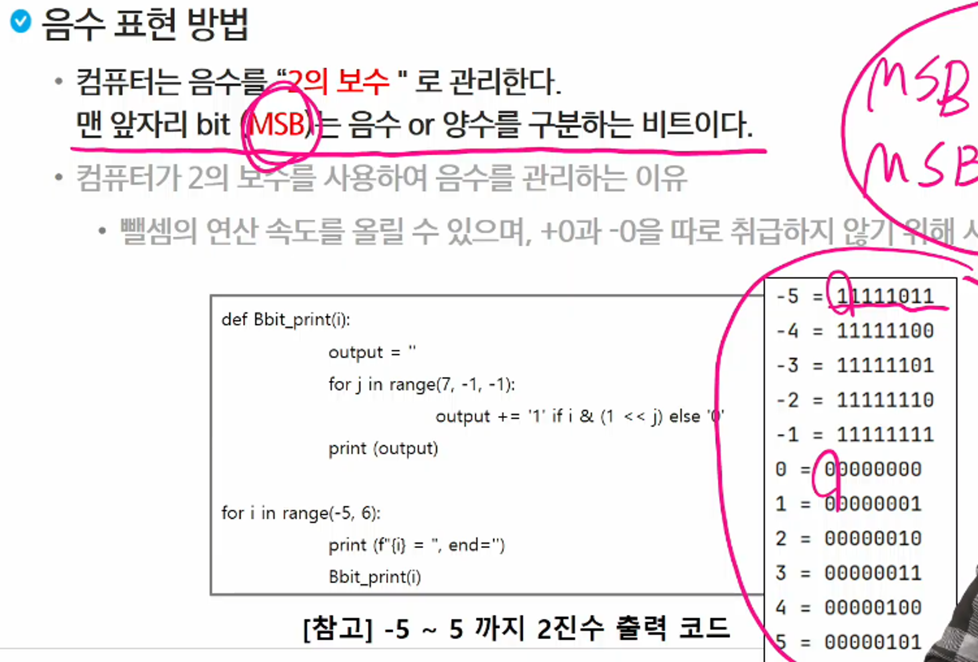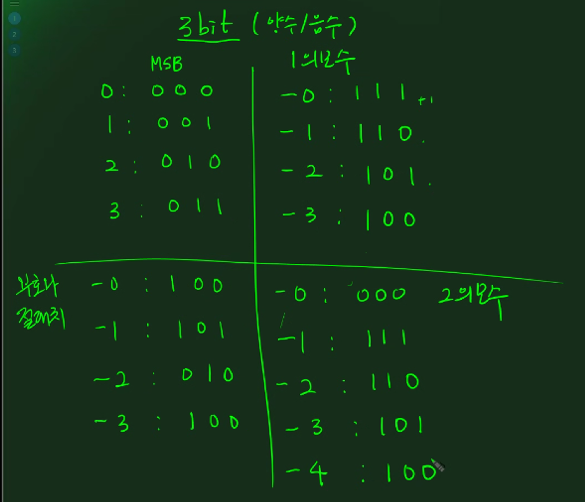 맨 앞자리 bit(MSB)는 음수 or 양수를 구분하는 비트이다.