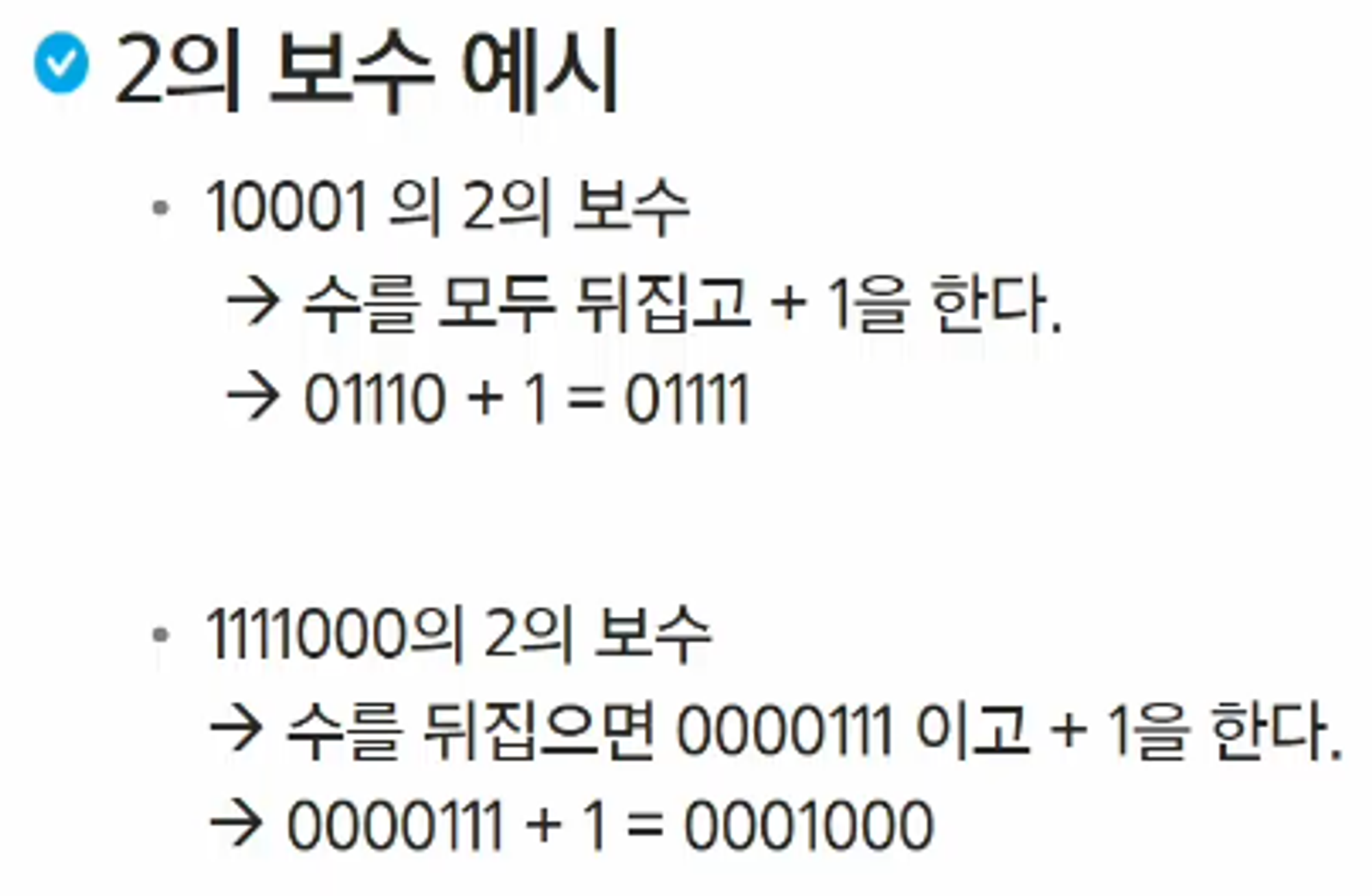 - 1111000의 2의 보수→ 수를 뒤집으면 0000111 이고 +1을 한다