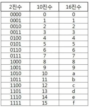 16진수 : 2진수를 더 가독성 있게 사용, 수 하나를 0,1 … 9, A,B,C,D,E,F 로 표현