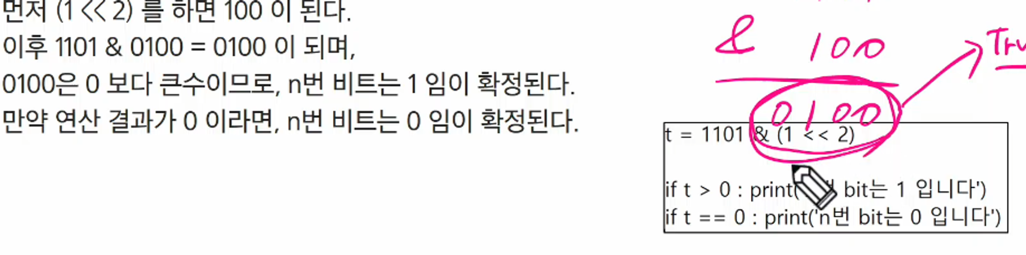 i의 n번 비트가 1인지 아닌지를 확인할 수 있다.ex) 1101 & (1<<2)위 연산으로 1101 에서 2번 bit가 1인지 확인 가능하다.1101 & 0100 = 0100만약 연산결과가 0 이라면, n번 비트는 00100은 0 보다 큰 수, 0100 > 0 n번 비트는 1이 확정1<<2 = 100