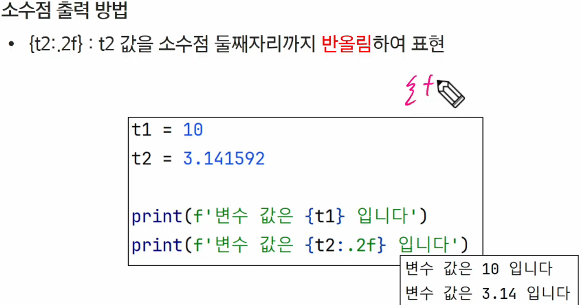t1 = 10 t2 = 3.141592 print(f'변수 값은 {t1}이다') # t2 값을 소수점 둘째자리까지 반올림하여 표현 print(f'변수 값은 {t2:.2f}이다') # 3.14
