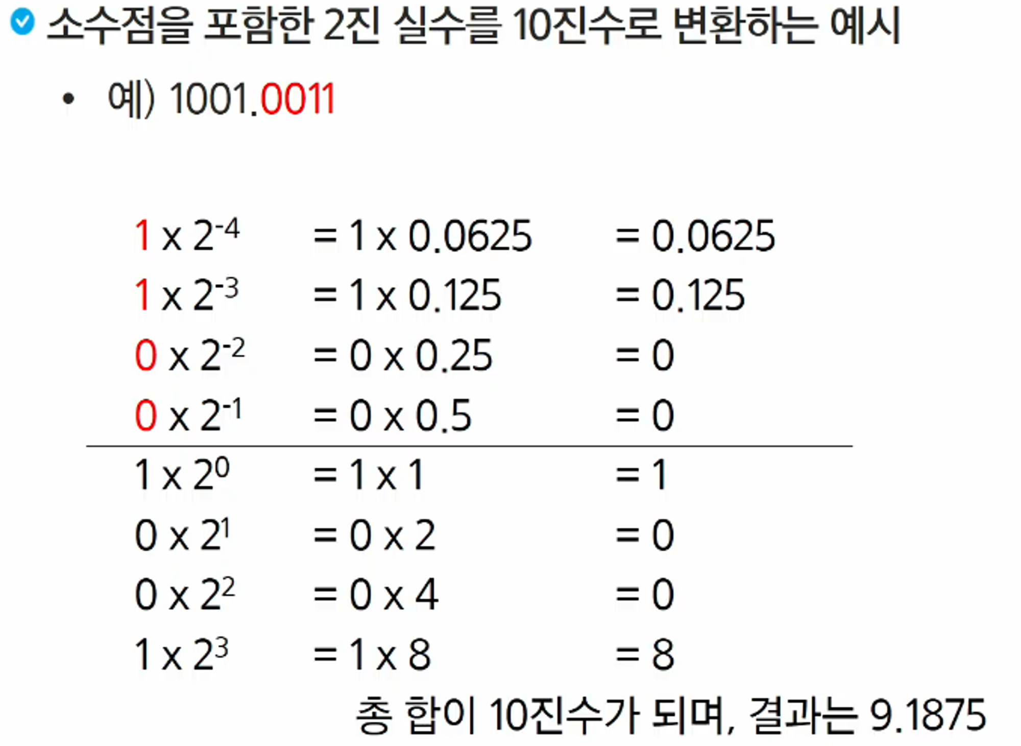 소수점을 포함한 2진 실수를 10진수로 변환하는 예시