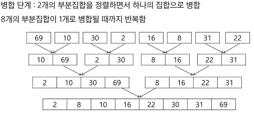 - 여러 개의 정렬된 자료의 집합을 병합하여 한 개의 정렬된 집합으로 만드는 방식